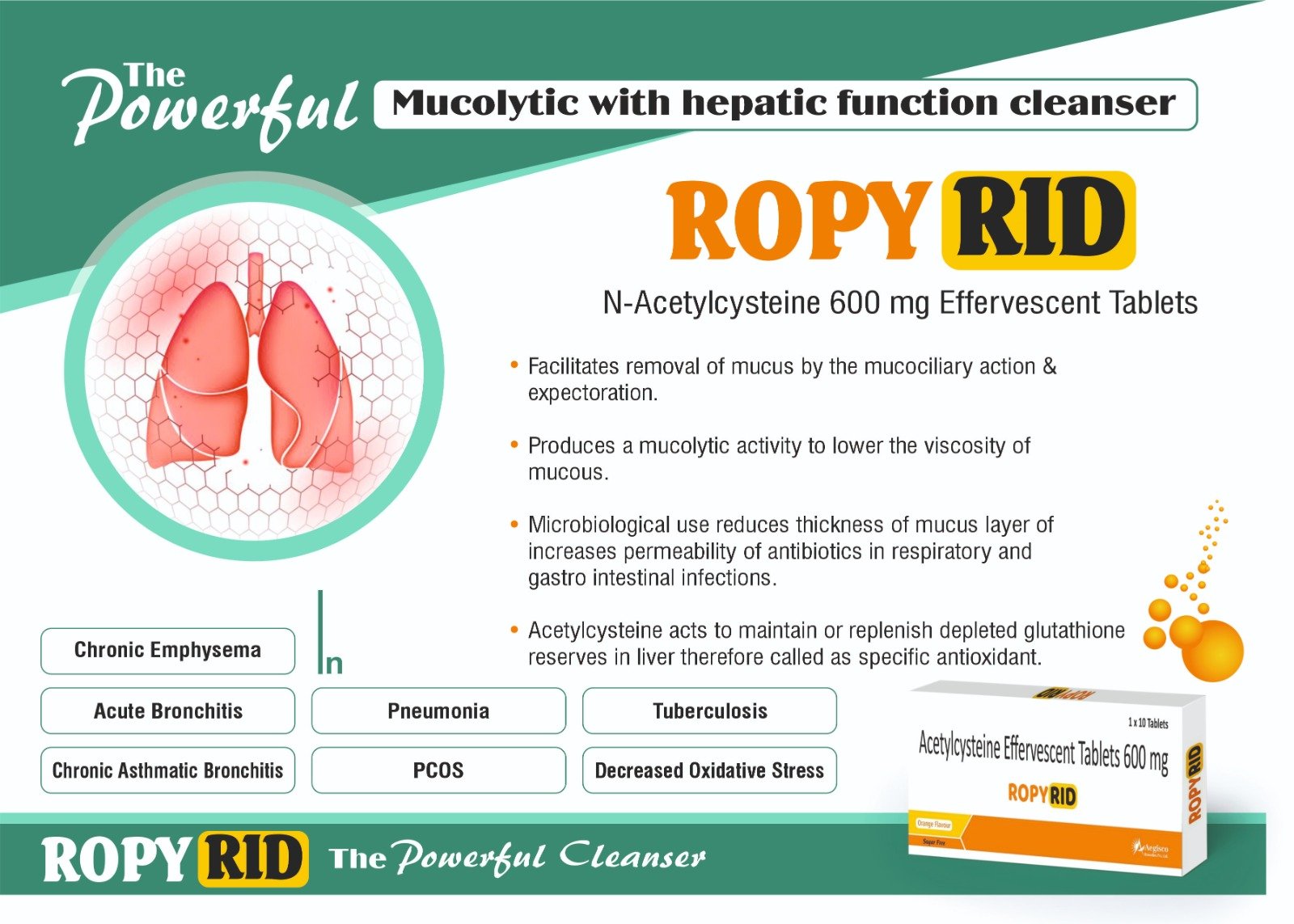 - Acts as a mucolytic and bronchodilator to manage chronic lung obstruction, bronchitis, and pneumonia.